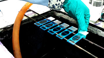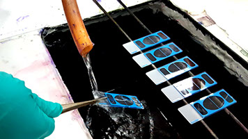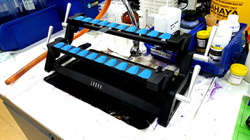 Conventional way of rinsing slides. One hand lifting the slides using forceps and the other holding the hose.