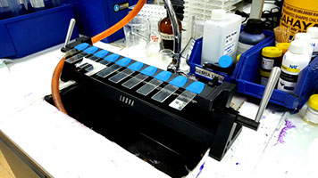 Slides are placed into Luova Slide Stainer. No loose positioning slides that risk falling into the sink.